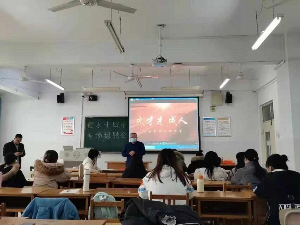 会上,衡水十四中负责人尹董事长通过播放宣传片、PPT展示、面对面交流等方式,对集团概况、应聘要求、福利及工资待遇等做了详细介绍。接着,尹董事长对毕业生提出的各种问题做出了详细解答。
