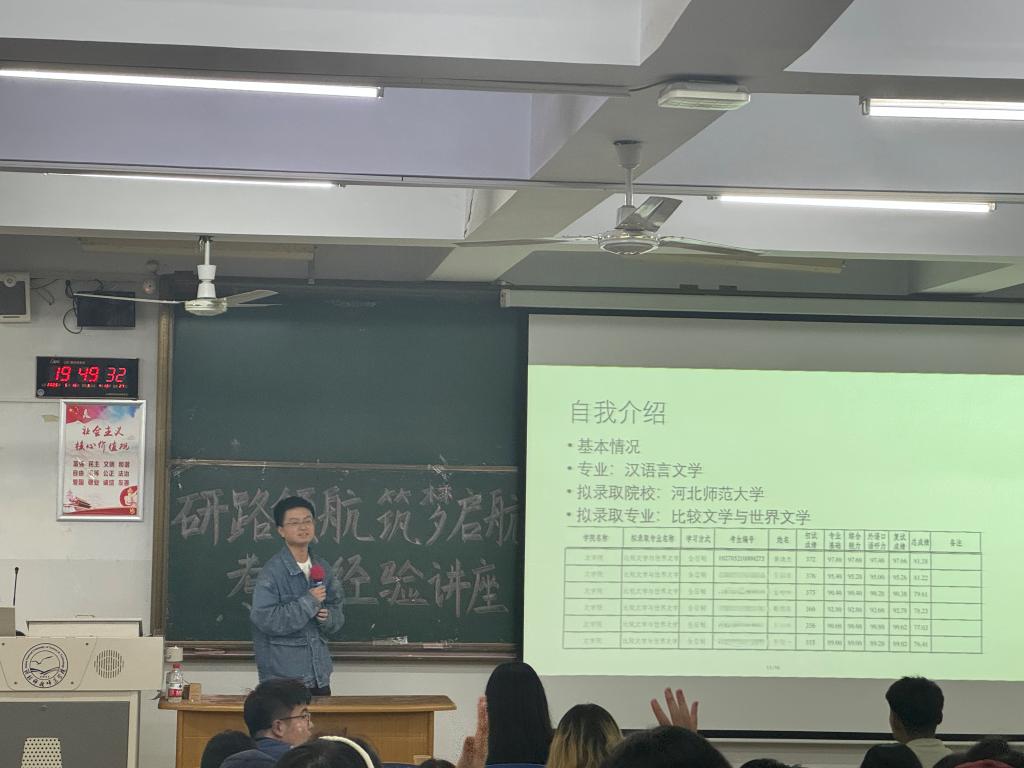 在本次考研经验分享讲座中,乐天使为此次讲座做了充足的准备,工作人员为此次讲座做了全面的后勤保障工作,确保讲座的顺利进行。来自汉语国际教育、汉语言文学、社会工作、法学以及知识产权专业的学长学姐将自己的考研经验耐心的传授给同学们,讲述了考研流程、考研准备时间以及自己在考研过程中的心路历程、遇到的挑战、以及最终得到的经验;还为同学们提供了可以参考的网课以及资料。过程流畅自然,充满了关于考研的经验性知识。参与本次讲座的同学们认真聆听,不错过每一条考研经验,并积极与学长学姐进行了有效的互动,现场气氛一片活跃。伴随着最后一位知识产权学长的生动讲述,本次讲座取得圆满成功。让同学们对自身考研有了更为清晰的认知,获得了许多有用的考研经验,为日后考研打下基础。
