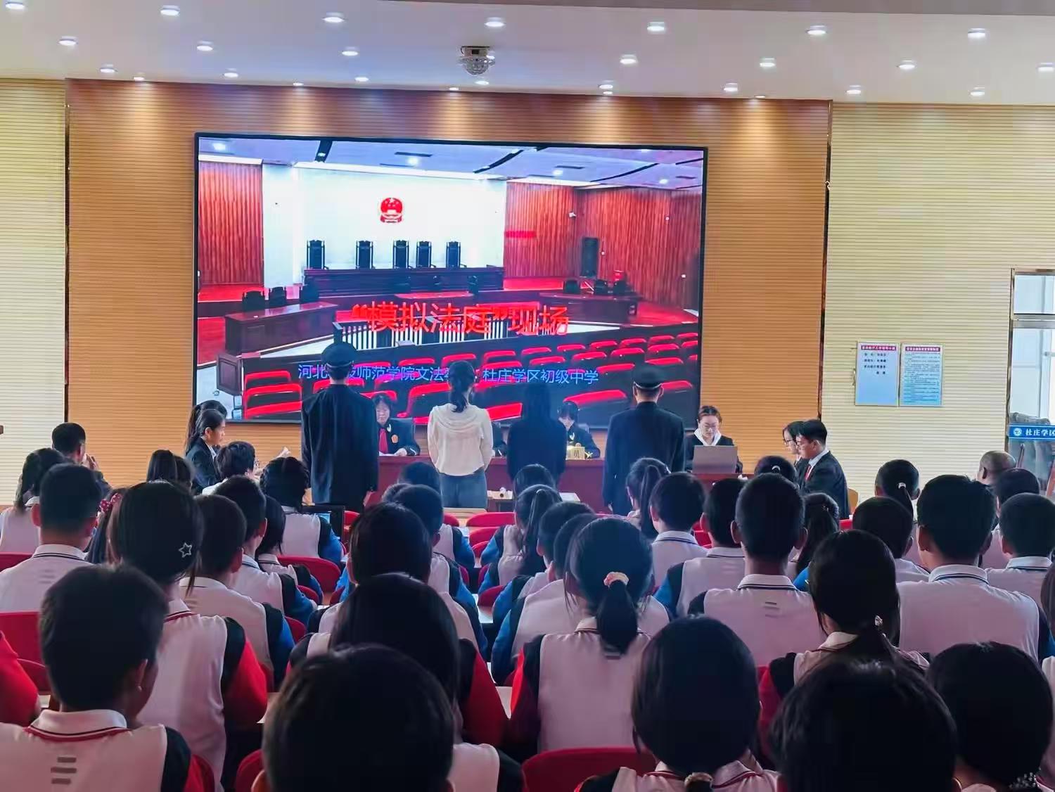 在杜庄中学,公司志愿者同学开展了关于未成年人刑事案件模拟法庭表演活动.真实的庭审过程,让现场观摩的师生和家长代表零距离体验和了解了法庭审理的程序,学习了相关的法律知识,深刻体会到法律的威严和神圣。王慧经理对涉及的法律问题进行深入讲解和分析,为杜庄中小学进行了相关答疑,得到了杜庄中小学同学、教师、家长的一致好评。同学们积极参与,认真学习法律知识,并表示一定在日常生活中学法、守法、用法。